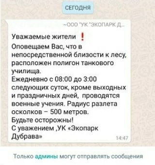 Невероятную заботу по отношению к своим клиентам на днях проявила управляющая компания «Экопарк Дубрава», обслуживающая одноименный жилой комплекс. Жильцам ЖК в группе WhatsApp разослали предупреждение о том, что их может зашибить осколком танкового снаряда! — рассказали в одном из пабликов.