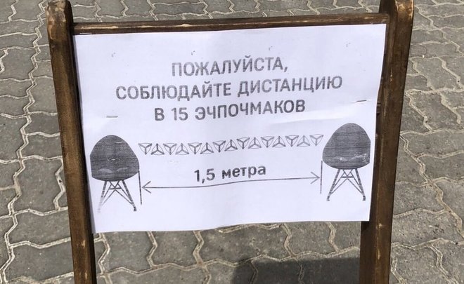В центре Казани одно из заведений удивило пользователей сети своей мерой измерения социальной дистанции, которую необходимо придерживаться во всех общественных местах по требованию Роспотребнадзора. В кафе предлагают посетителям держать между собой дистанцию в 15 эчпочмаках — 1,5 метрах.