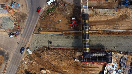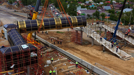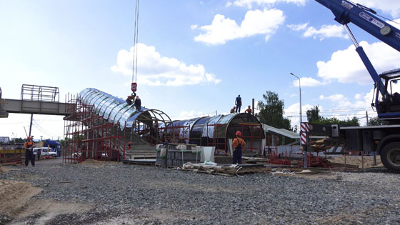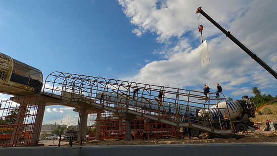 На строительстве надземного пешеходного перехода рабочие провели монтаж металлического пролетного строения между опорами №1и №2. На лестничных сходах устанавливают каркасы остекления и остекление монолитным поликарбонатом. На опоре № 4 закончили монтировать лестничные сходы.