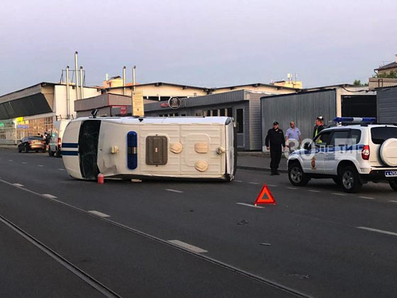 Авария случилась вчера днем на пересечении улиц Тази Гиззата и Бурхана Шахиди. По предварительной информации, полицейская «ГАЗель» пересекала перекресток с включенными спецсигналами. В этот момент в нее врезался кроссовер Renault. Удар был настолько сильный, что иномарку развернуло поперек дороги, а микроавтобус завалился на бок.