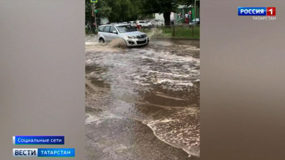 Сильнейший летний ливень обрушился днем на Татарстан. Ему хватило часа, чтобы устроить местами настоящий потоп. Видео снято на пр. Победы. Там стихия почти полностью парализовала движение. По данным сервиса «Яндекс», на некоторых участках дороги скорость движения не превышала и пяти километров в час. А вода поступала — даже с большей скоростью — прямиком в салон общественного транспорта.