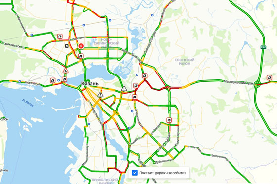 Движение затруднено на улицах Ершова, Аграрная, Аделя Кутуя, Космонавтов, Павлюхина, Фрунзе, Саид-Галеева, Мира. Кроме того, заторы наблюдаются на проспекте Победы, Мамадышском тракте и некоторых других участках. Также в сервисе отмечены семь аварий на территории города.