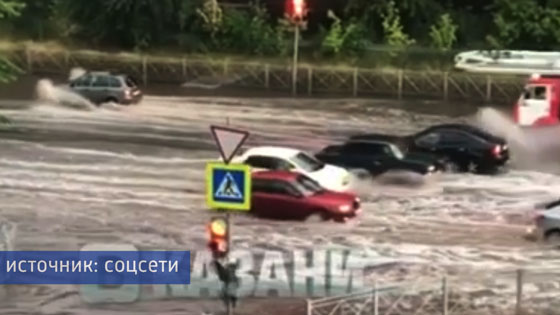 Казань вновь затопил сильный ливень, который накрыл столицу в этот вечер. Пользователи социальных сетей делятся кадрами, где вода поднялась до бамперов автомобилей.