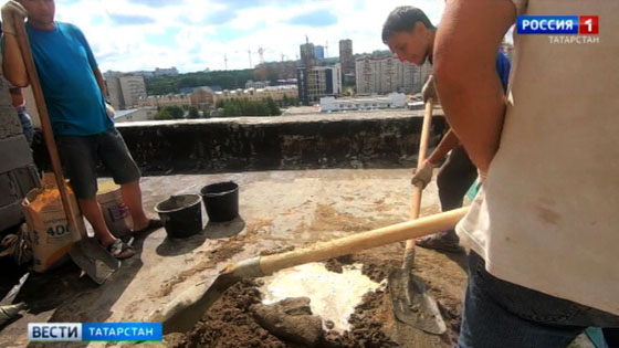 Ремонт на этой крыше начался три дня назад, он был запланирован, потому что кровля здесь изношена. И ничего не предвещало беды, но вчера на Казань обрушился ливень и воды затопила квартиры. Но только этот бытовой аттракцион не порадовал ни детей, ни их родителей. После того, как вода хлынула потоком, в квартире отключился свет. Последствия стихии пришлось устранять в темноте.