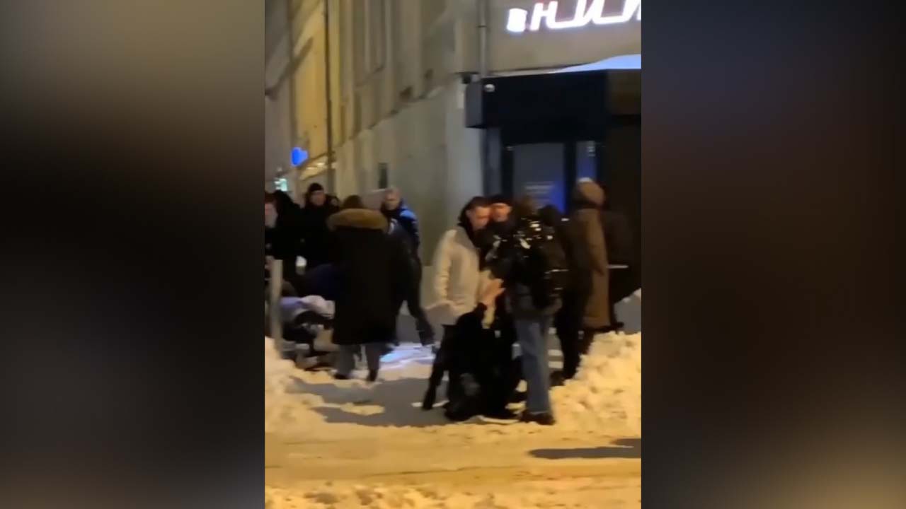 Судя по кадрам, в массовой драке приняли участие около десяти человек. Несколько молодых людей пострадали — видно, как они лежат на снегу