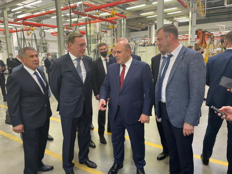 Ещё до начала совещания Михаил Мишустин осмотрел сам завод. Премьер-министру показали завод двигателей, завод каркасов кабин на электробусы и завод каркасов кабин. Здесь он осмотрел цех сварки, окраски.