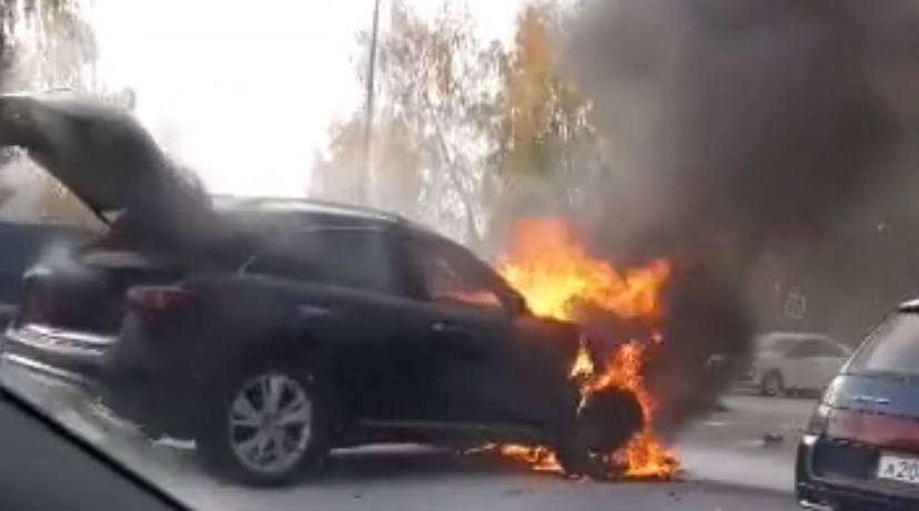 На кадрах видно полыхающую огнем черную иномарку. Судя по видео, машина загорелась прямо на ходу.
