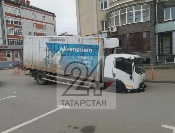 В Казани грузовик провалился по асфальт. Об этом сообщает «Татарстан 24».