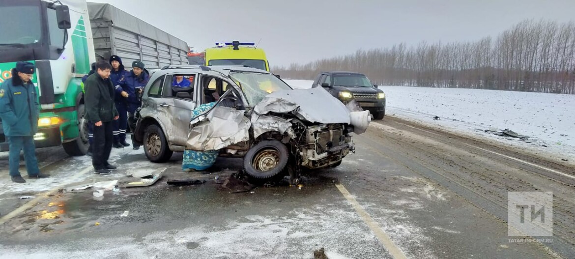 ДТП произошло накануне утром в Апастовском районе у деревни Чуру-Барышево. От удара легковушку сильно смяло, а грузовик вылетел в кювет и перевернулся на крышу.