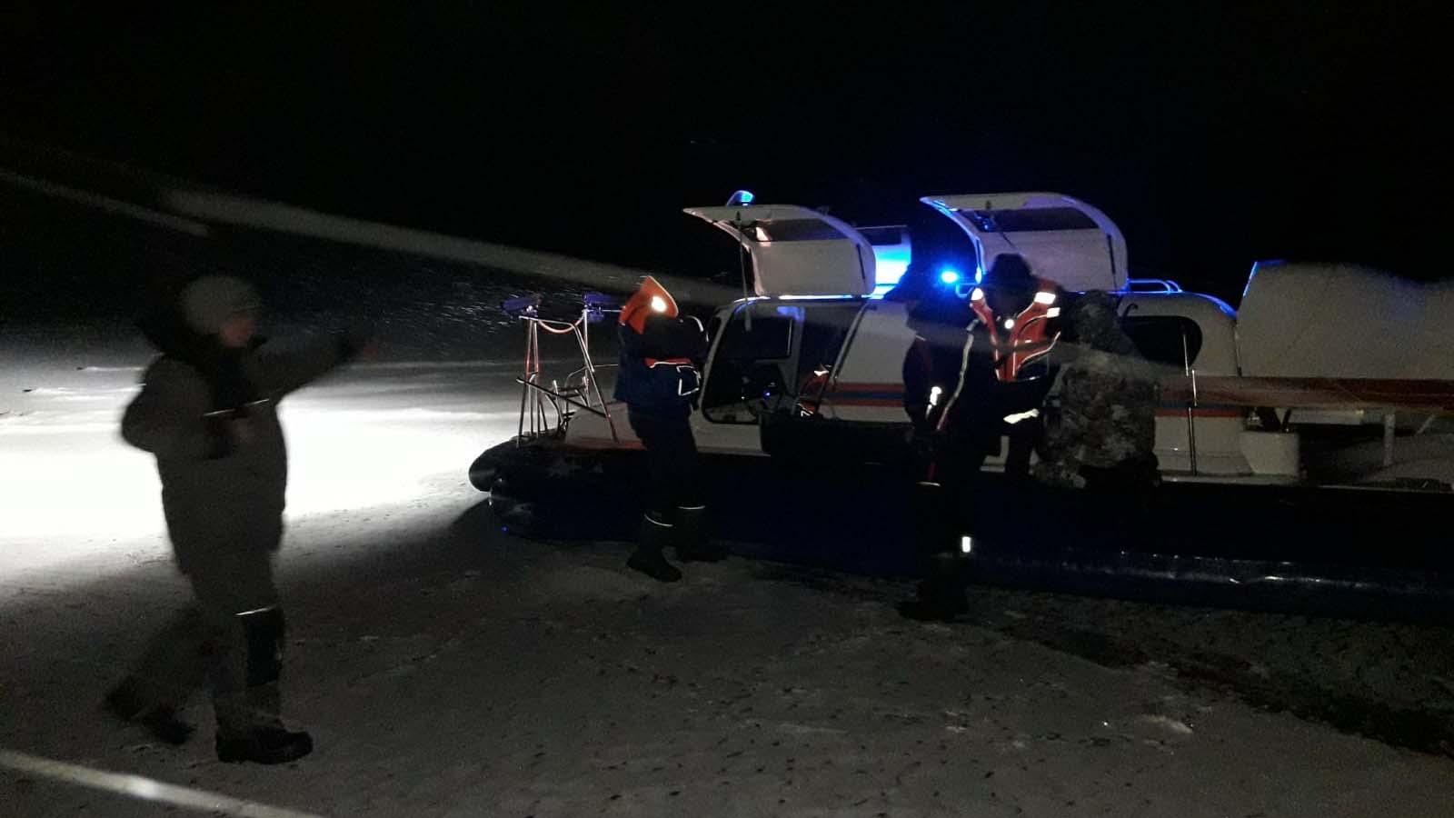 Сотрудники круглосуточного спасательного поста на судне на воздушной подушке выехали на помощь любителям зимней рыбалки. Они проехали около 35 километров, к тому времени уже порядком стемнело и мужчин нашли по сигналам фонарика.