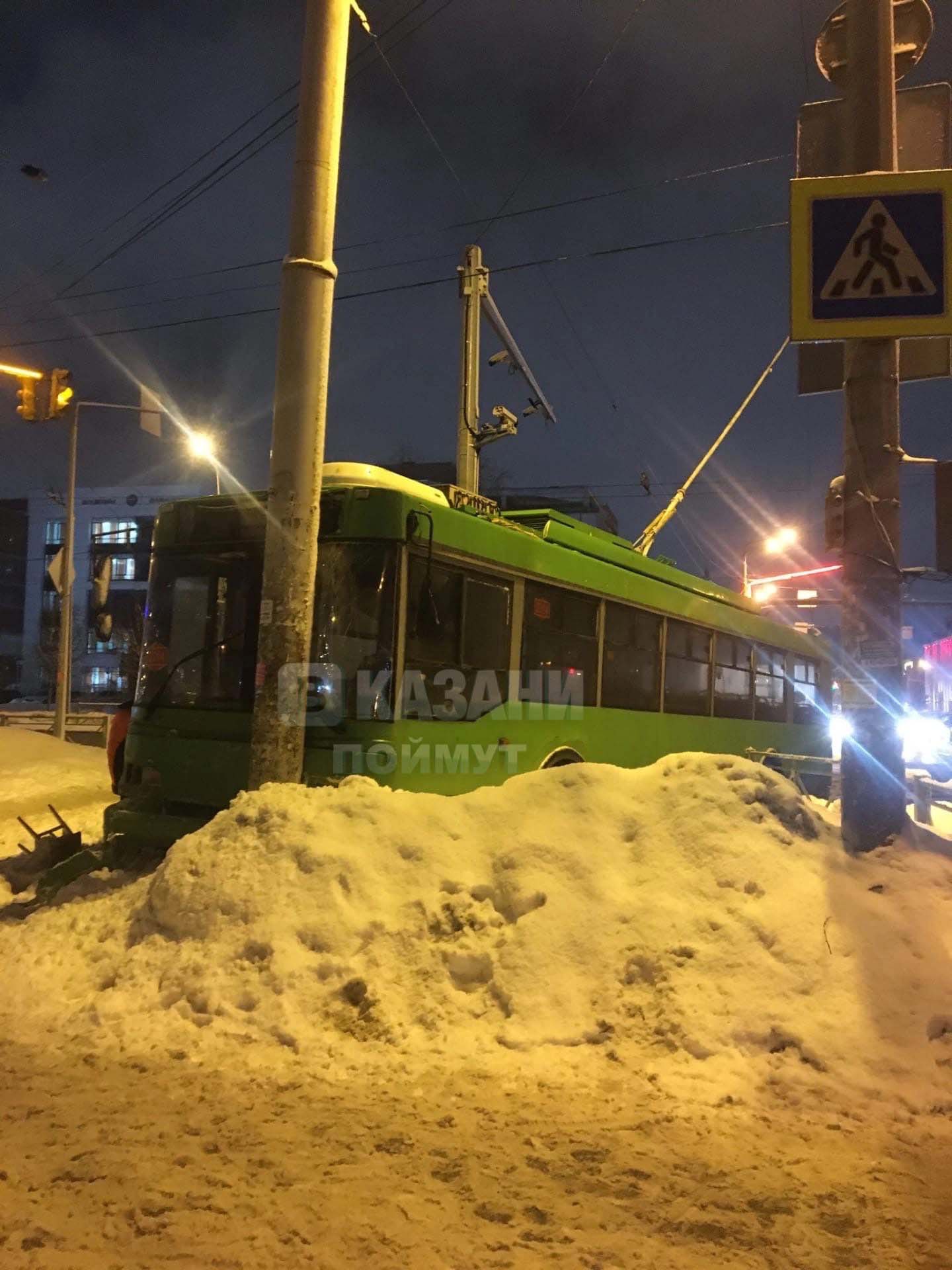 В Казани на перекрёстке улиц Павлюхина-Назарбаева троллейбус вылетел на обочину. Причиной аварии стал манёвр неизвестного водителя. Об этом сообщили в МУП «Метроэлектротранс».