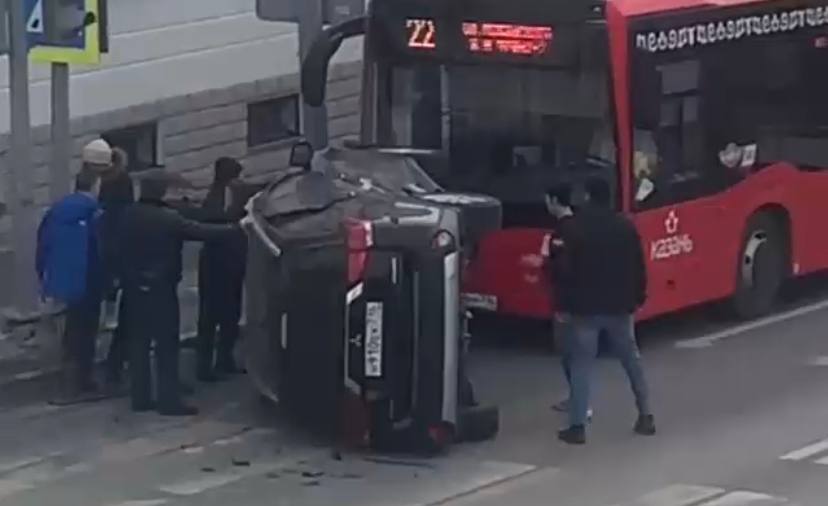 В центре Казани перевернулся автомобиль с двумя детьми в салоне. Об этом сообщают очевидцы в социальных сетях.