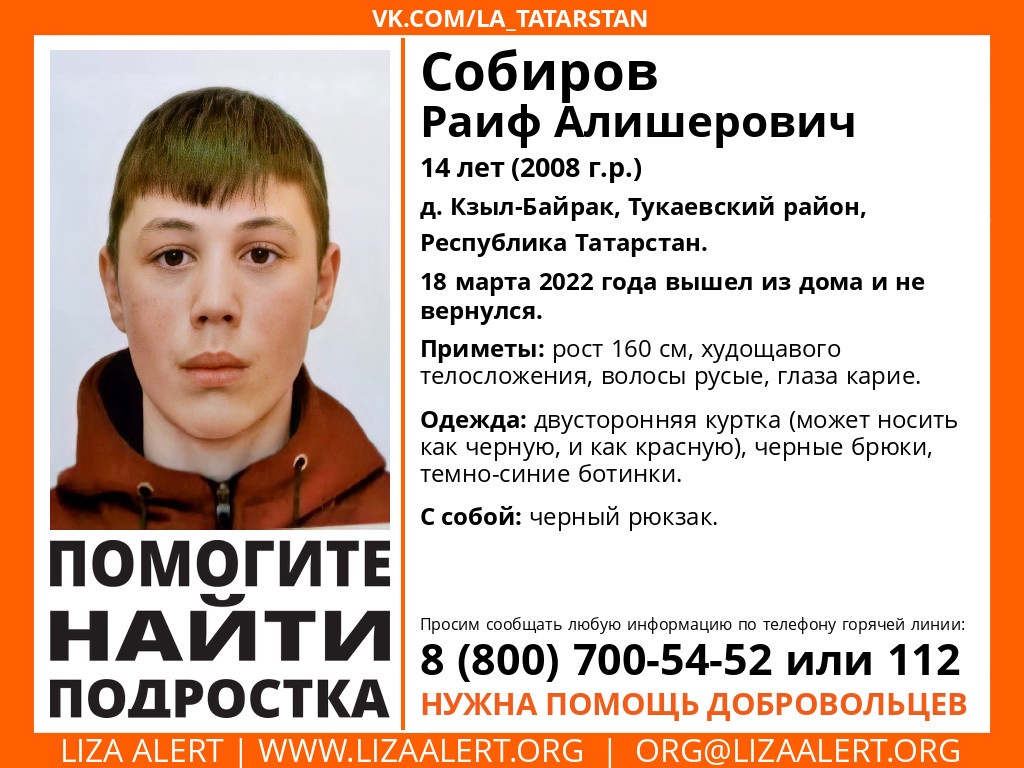 Уже второй день в Татарстане ведут поиски 14-летнего Раифа Собирова. Юноша ушел из дома 18 марта и с тех пор от него нет никаких вестей. Об этом сообщает поисковый отряд «ЛизаАлерт».