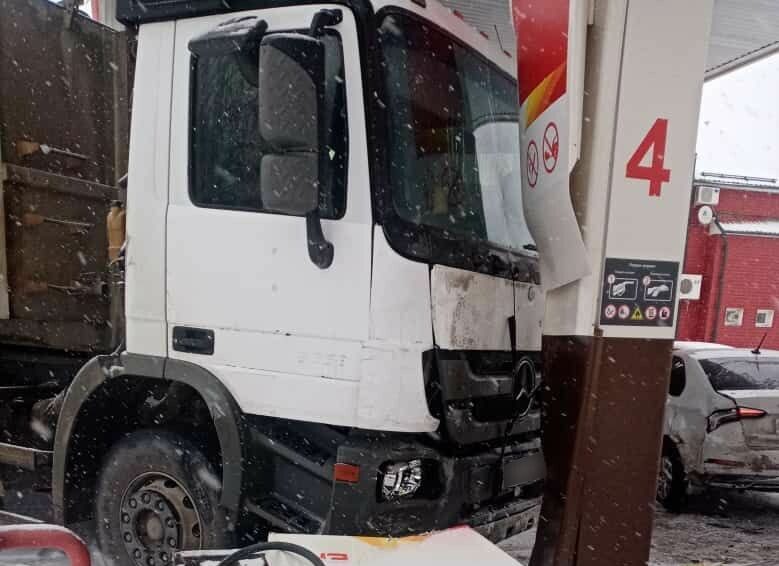 Водитель грузовика въехал в АЗС и еще в три легковушки, не справившись с управлением заснеженной дороге.
