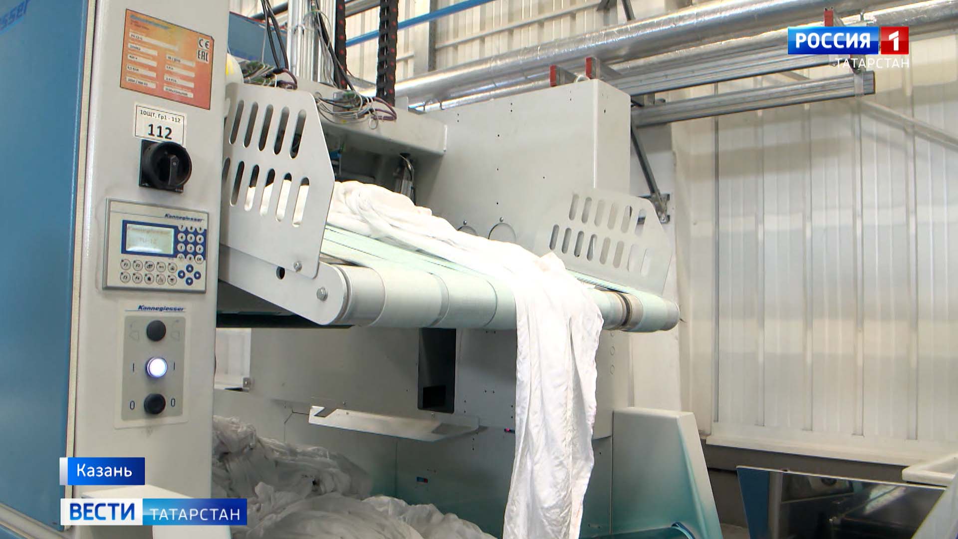 А это предприятие обслуживает республиканские больницы. Промышленная стиральная машина очищает сотни килограммов белья. Эти организации арендуют белье, у частной компании, которая занимается его обслуживанием. Текстиль пропускают через конвейер с множеством станков, за ними присматривают работники.