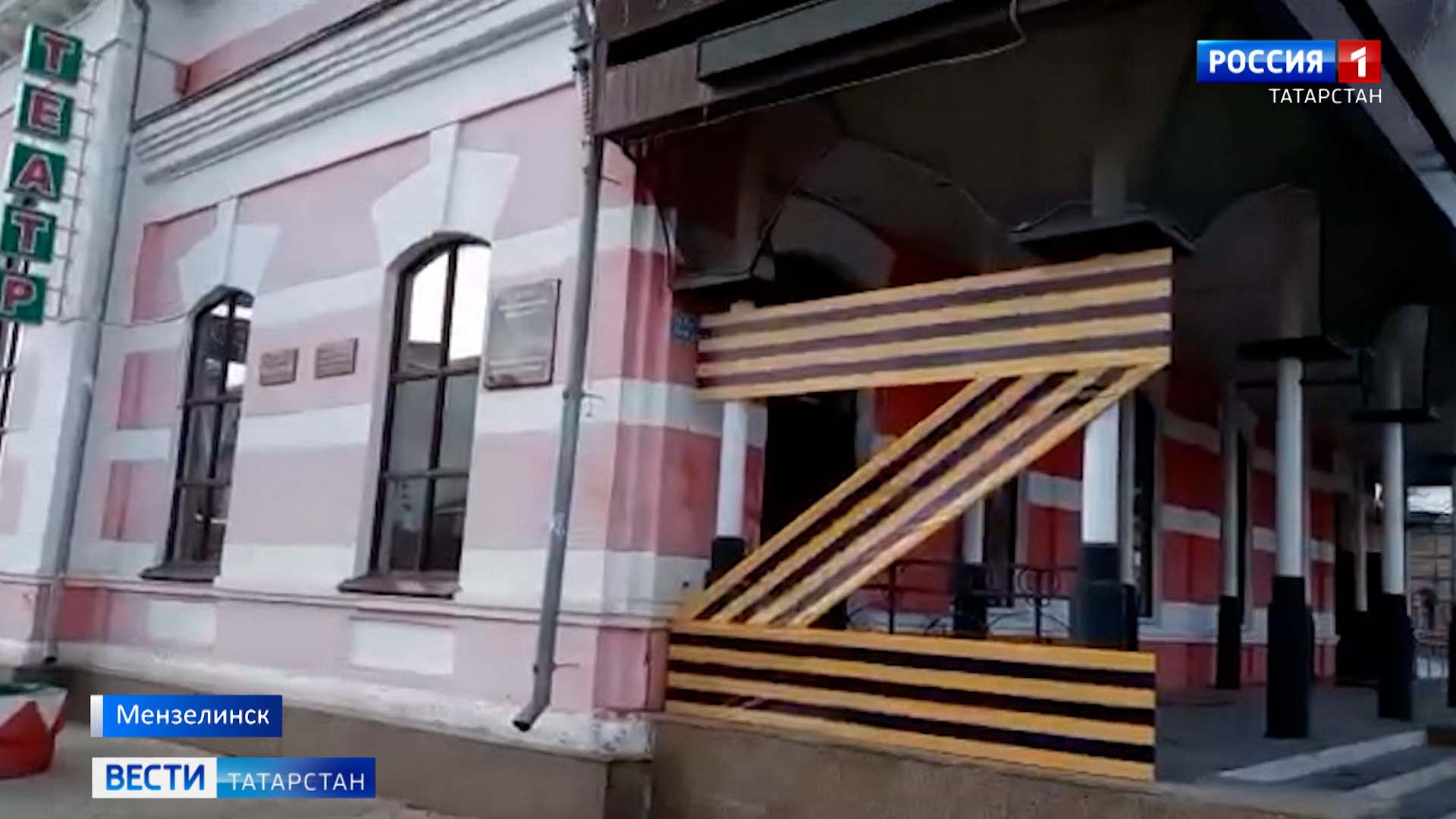 За победу и За мир. Георгиевская лента в виде буквы Z теперь есть на фасаде Мензелинского драмтеатра имени Амутбаева. Так коллектив решил поддержать российскую армию, проводящую специальную операцию на Донбассе. Горожане идею артистов оценили. Жители останавливаются и фотографируются на фоне здания.