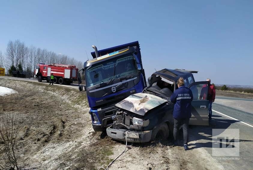 Авария произошла накануне днем на автодороге Базарные Матаки – Нурлат. По информации агентства, внедорожник Toyota не уступил дорогу самосвалу Volvo. В результате многотонный автомобиль ударил об переднюю левую часть.