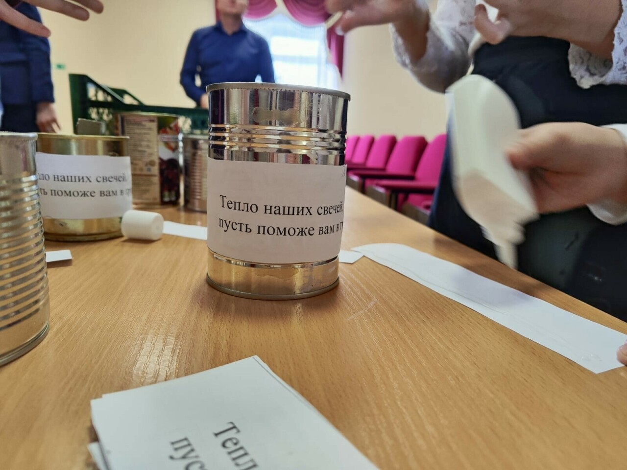 Ученики также присоединились к процессу и помогают в создании свечей. Всего за полчаса было сделано 80 штук. Жители клеят на свечи этикетки с посланиями, чтобы солдаты чувствовали тепло родного края.