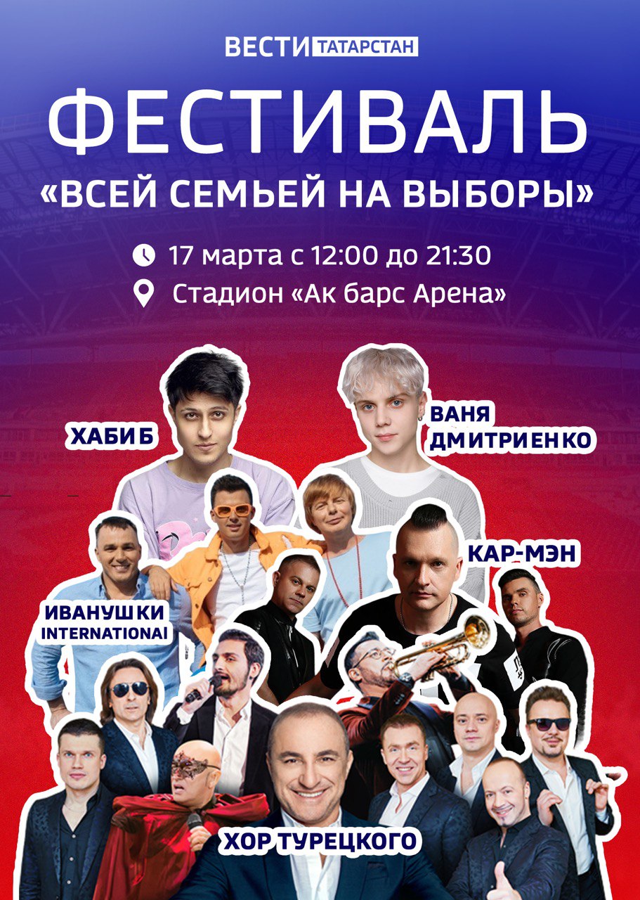 17 марта в Казани на стадионе «Ак Барс Арена» состоится семейный фестиваль. Для посещения мероприятия необходимо проголосовать на избирательном участке и получить специальный браслет.