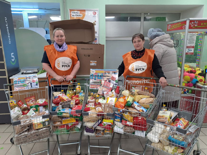 Благотворители приобрели продукты с долгим сроком хранения, включая макароны, консервы, растительное масло, чай, кофе, конфеты, печенье и другие товары.
