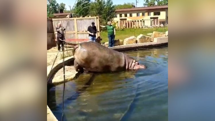 Ведущий Иван Затевахин снимает эпизод с участием бегемотихи по имени Захарья, которая прогуливается по вольеру и плавает в своем бассейне.